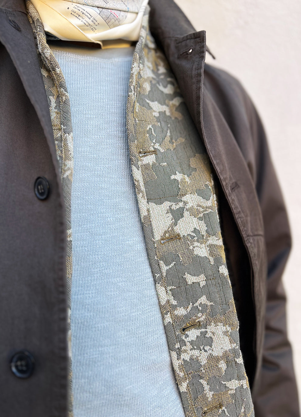 The fabric is a solid closely woven gabardine twill from Italy with a washed-effect surface. Gaberdine twill has a diagonal, slightly ridged weave and was invented in the 1800s by Thomas Burberry but is still widely used because of its durability and comfort.