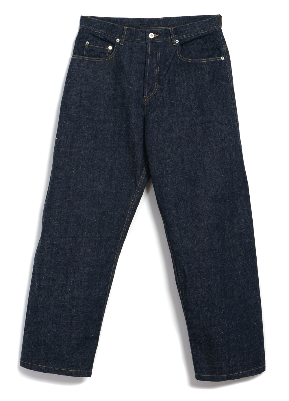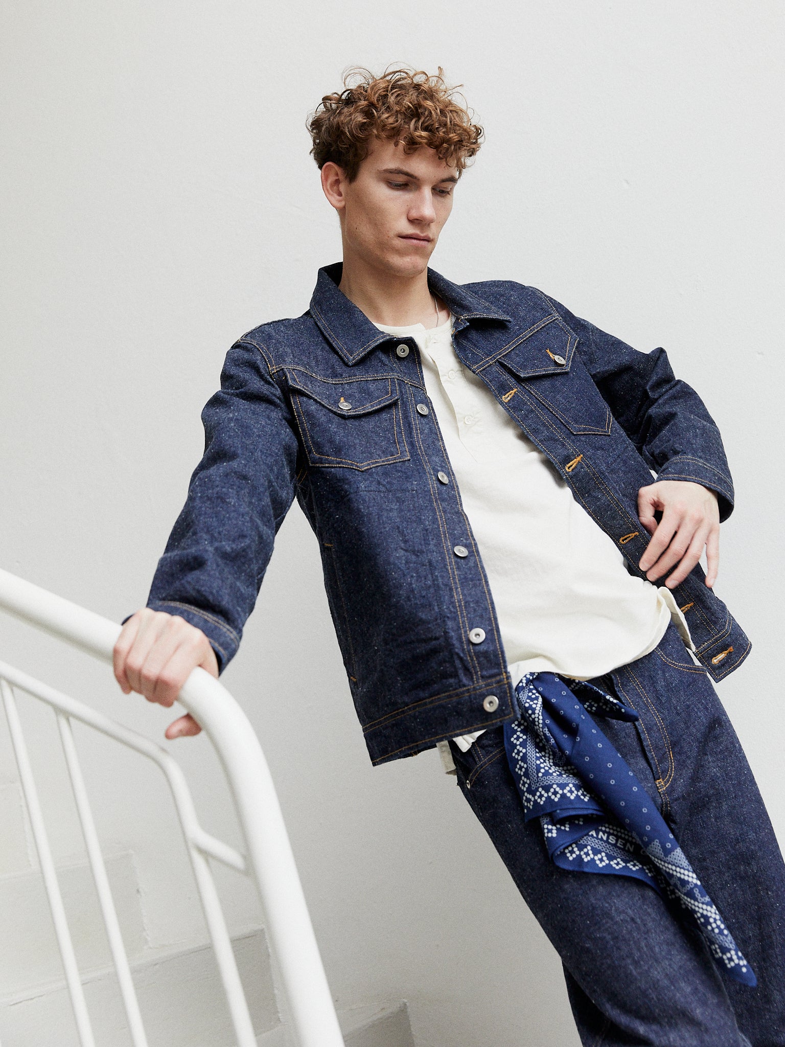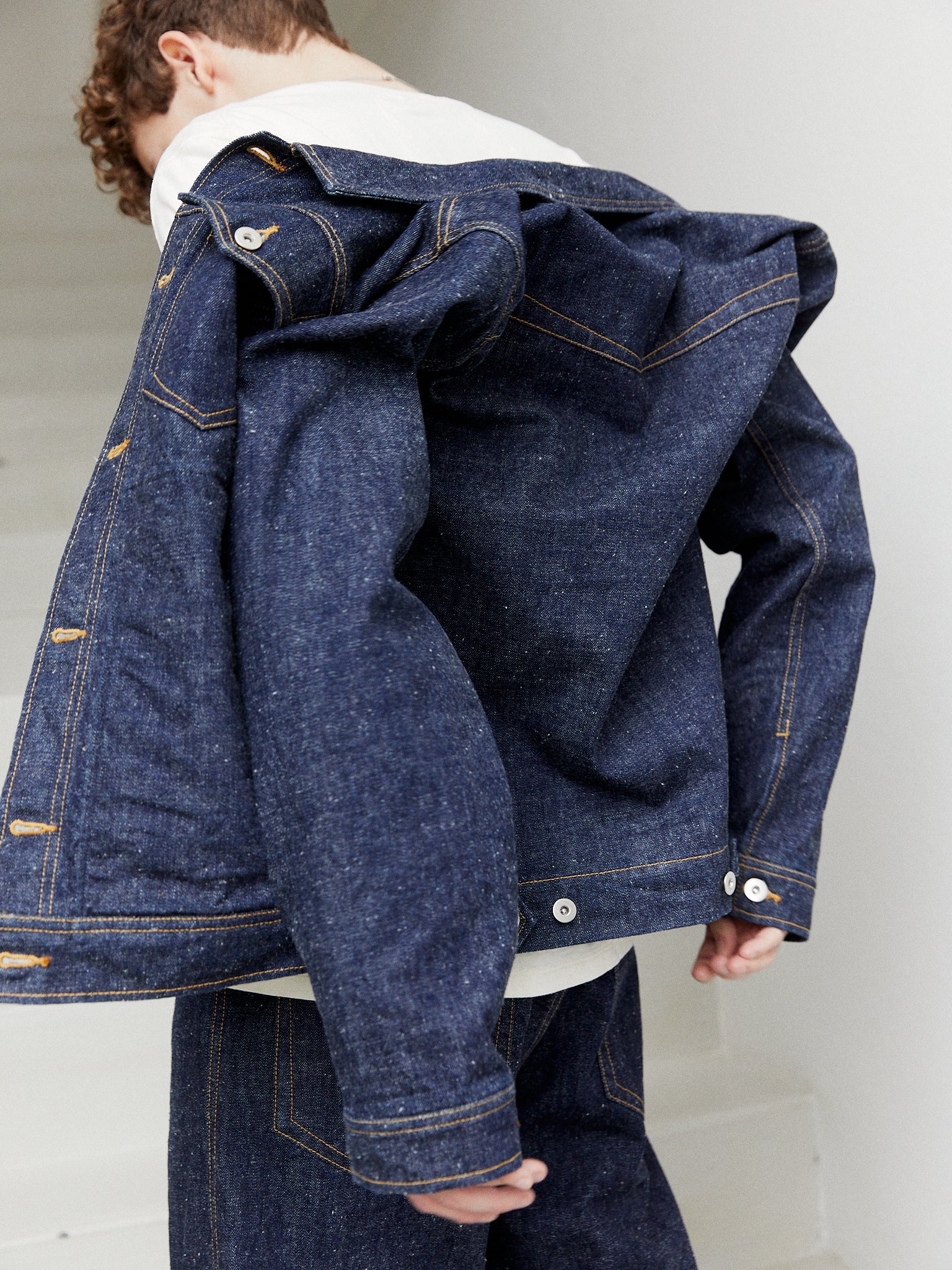 Working with a highly regarded jeans factory in the traditional denim region of Okayama in Eastern Japan, we chose a loom-woven 13oz ‘neppy’ denim - one that has visible ‘neps’ or flecks on the surface, giving the fabric a rich texture and more rustic, used appeal. As well as utilising the factory’s expertise, in the design process it was important that we recognised the codes of vintage denim workwear - the seams, the trims, the stitching - but adapt them to something that fits in with the HANSEN aesthetic.