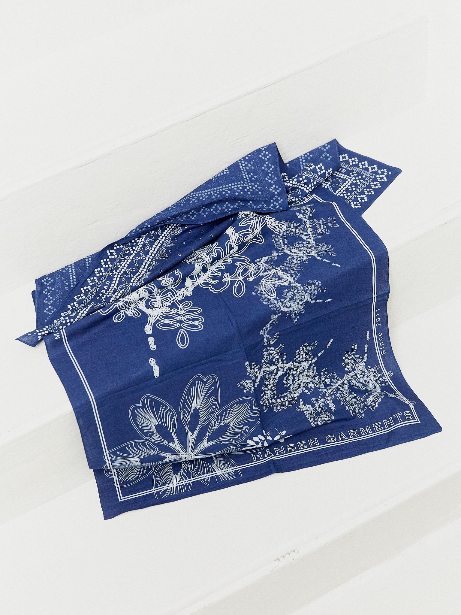 Finally, two indigo dyed, silk screen discharge printed bandanas - one featuring botanical drawings of the Indigofera plant and the other a more graphic design based on Norwegian knitwear patterns - add a finishing touch.